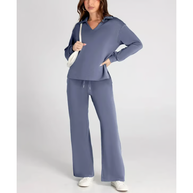 The sweat sets designed with a sporty polo collar, V-neck and high-low hem,high waisted pants with Drawstring,drawcord for a custom fit with a loose fit that reveals wide legs,High-low hem offers extra coverage in back, 4-way stretch for easy movement.